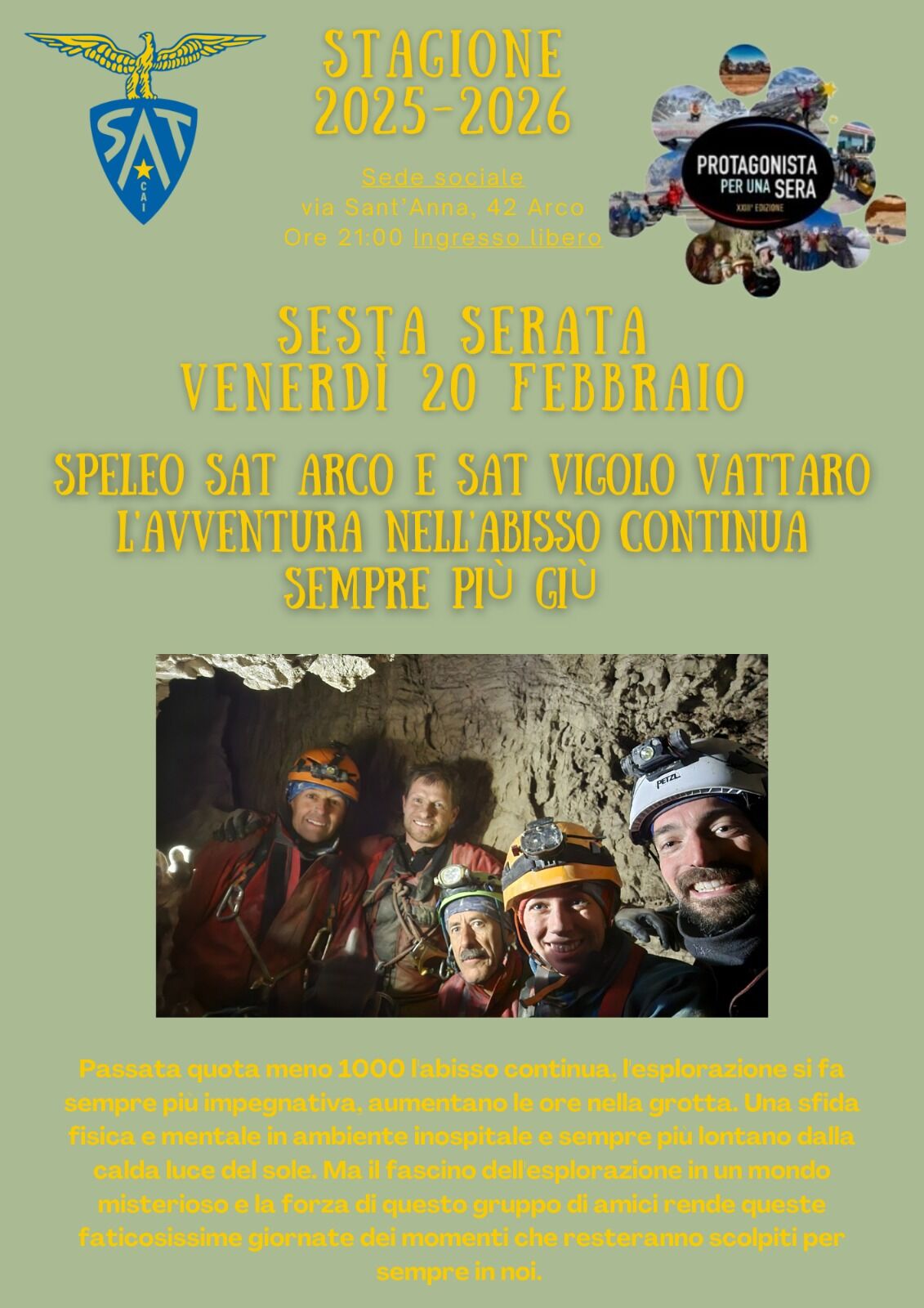 Prossimo appuntamento è venerdì 20 febbraio. Protagonisti della serata saanno i gruppi Speleo di SAT Arco e SAT Vigolo Vattaro e presenteranno laL'AVVENTURA NELL'ABISSO CONTINUA SEMPRE PIU' GIU'.
